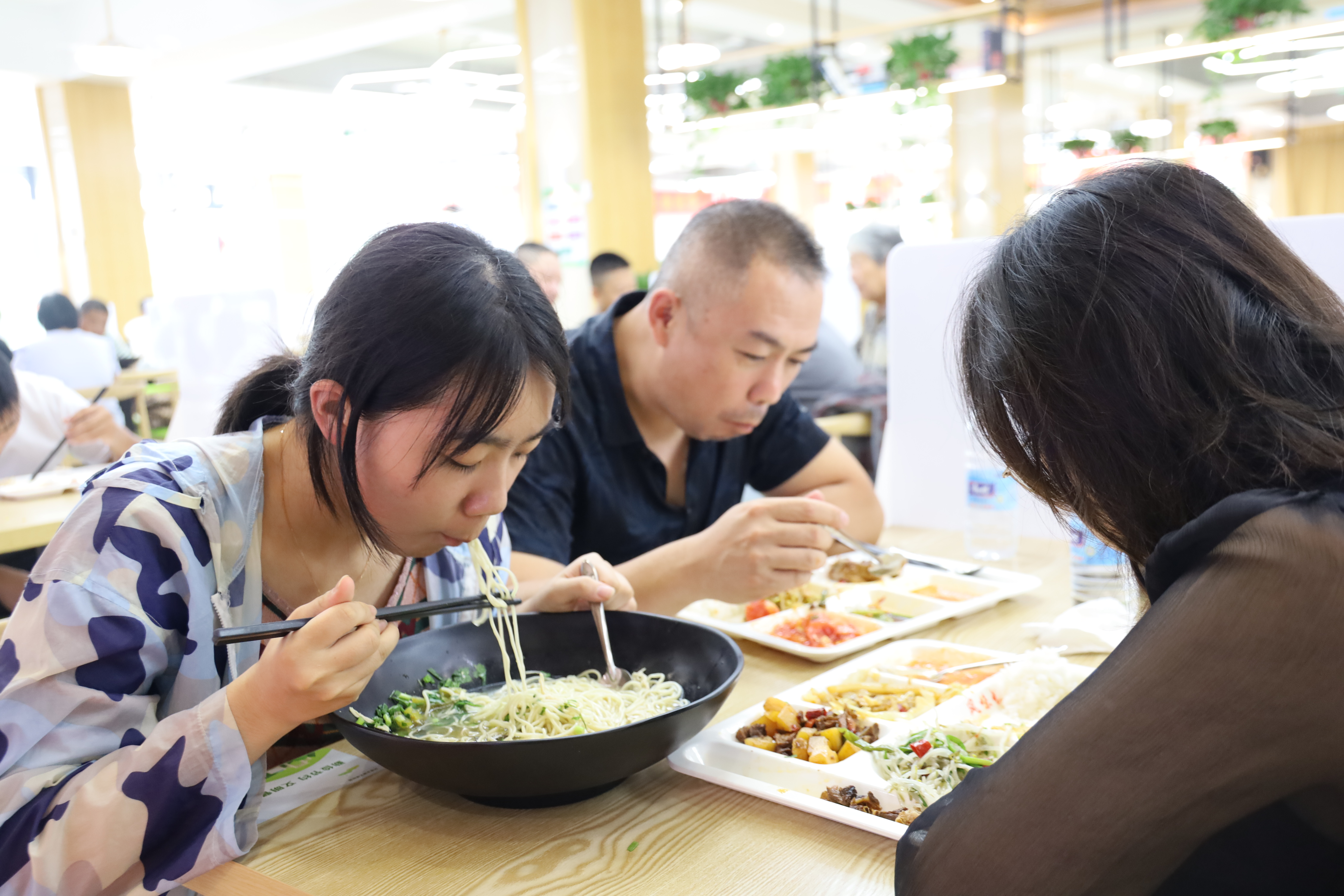 目光转到食堂,新生和家长们都在津津有味地享受学校食堂的午餐,一副温馨和谐的场面。