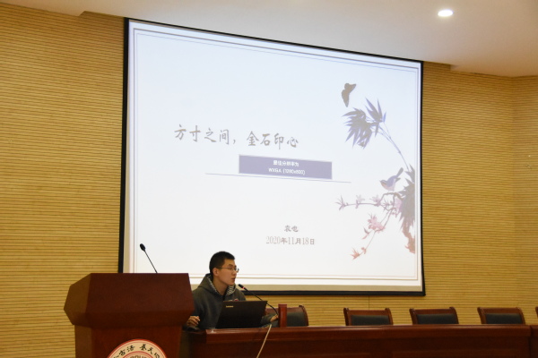 2020年11月18日14:00—15:30,文学院“传统文化公益课堂”在交通楼二楼学术报告厅举行。此次讲座的主要内容是:“方寸之间,金石印心”——篆刻的源流与原理,主讲人为文学院古代文学硕士袁也学长。