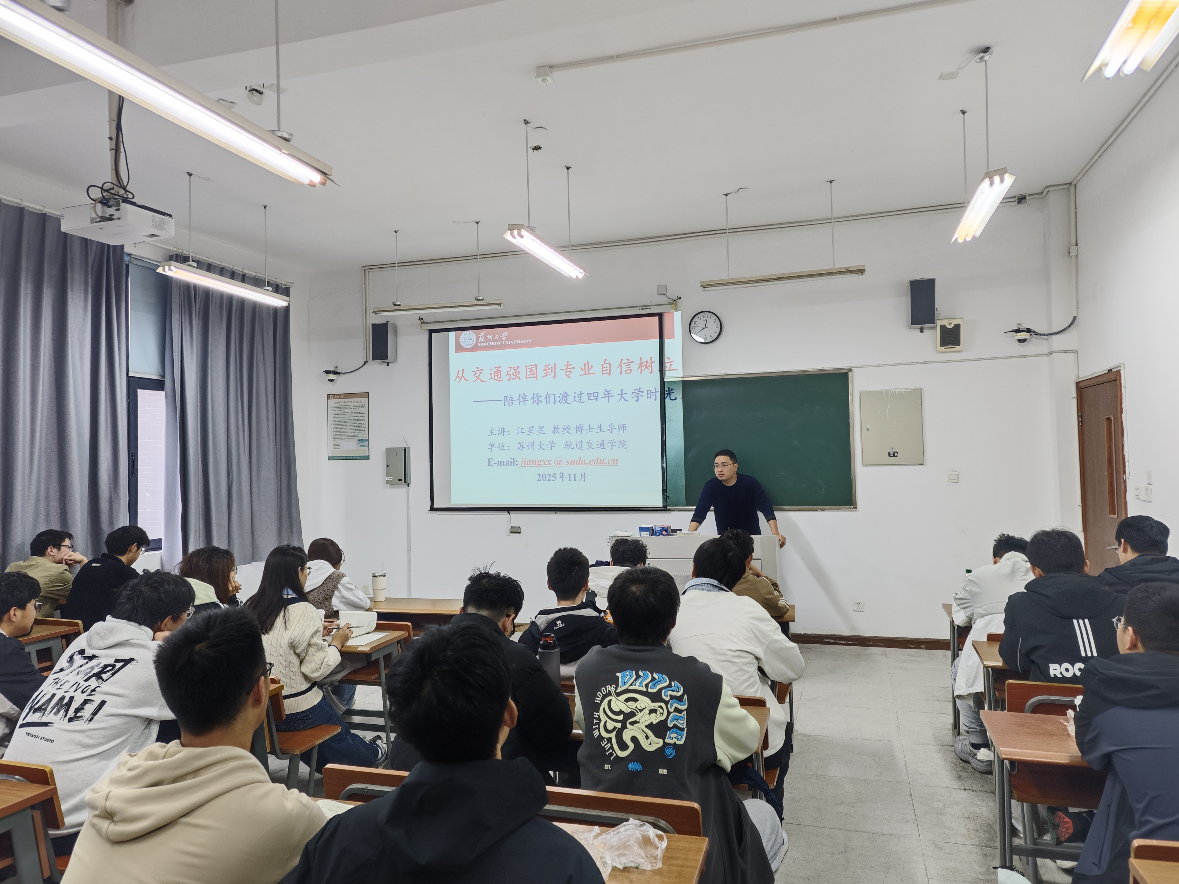 江星星教授主讲了题为《从交通强国到专业自信树立》的专题讲座,帮助同学们深化专业认知、树立行业自信。讲座紧密围绕国家“交通强国”战略部署,结合《国家综合立体交通网规划纲要》等重要文件,深入阐释战略背后的国家需求与时代内涵,系统梳理了轨道交通从技术追赶到自主引领的发展历程,并展望智能高铁、磁悬浮技术等前沿方向。江教授还分享了我系多位毕业生在轨道交通设计院、主机厂等单位的成长事迹,以“学长们的奋斗足迹”生动具象专业价值与职业前景。他勉励新生:“交通强国是国家战略的‘大动脉’,希望你们以专业能力为根基、以优秀前辈为榜样,在轨道交通事业中找准方位,让青春在强国建设的征程中绽放光芒。”