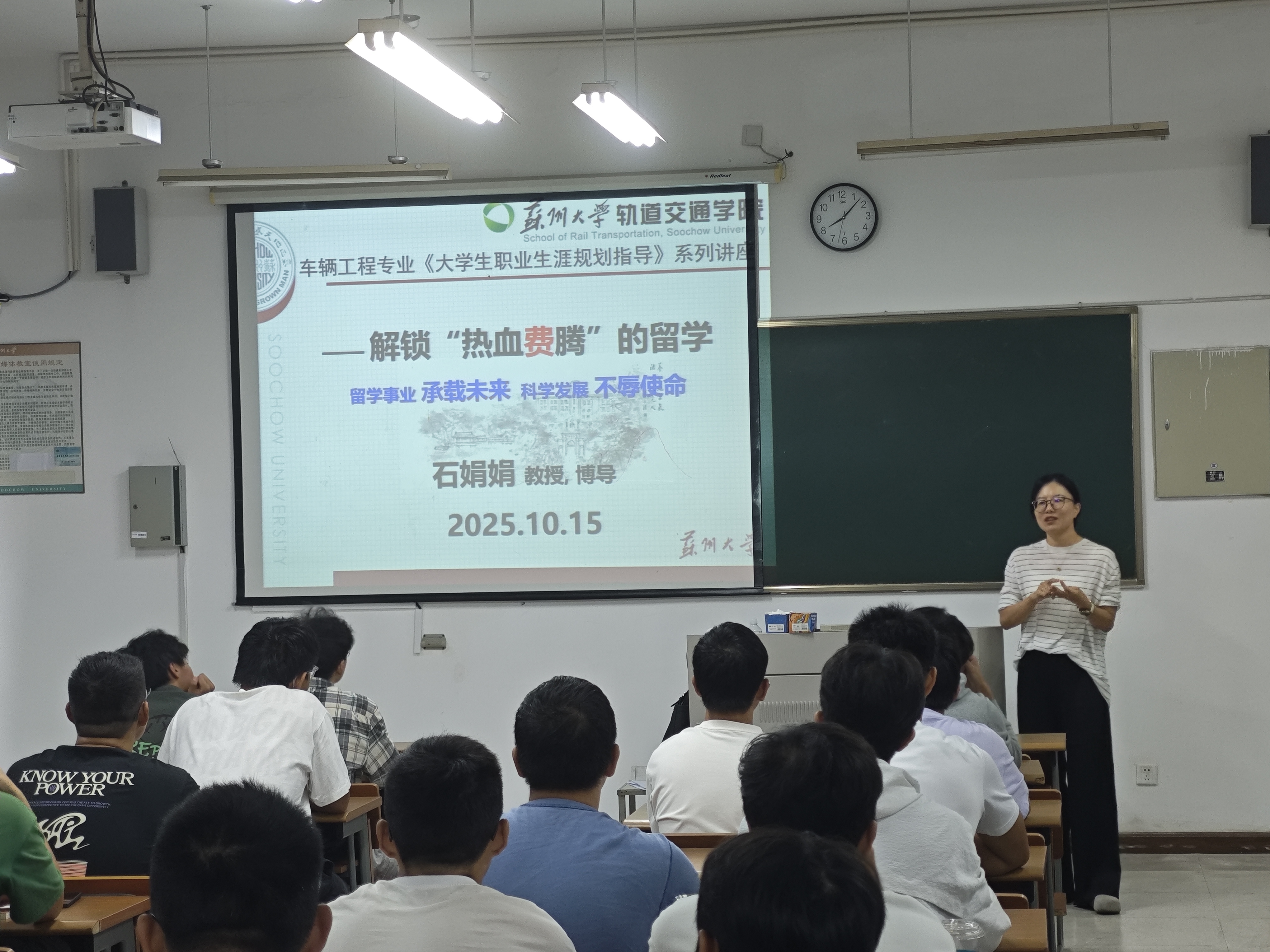 石娟娟教授为2025级新生带来了题为《解锁“热血费腾”的留学》的专题讲座。她以自己在加拿大攻读博士学位的真实经历为切入点,生动讲述了海外学习的挑战与收获,引导同学们理性看待留学、科学规划路径。石老师从语言能力提升、导师沟通技巧、公派留学政策解读等关键环节出发,系统梳理了留学申请的全流程,并针对常见误区提供了实用建议。她指出,留学不仅是学术深造的途径,更是跨文化理解与自我成长的重要阶段。在多元文化环境中学习,能够有效拓展认知边界、培养国际视野与独立思维。讲座最后,石老师特别强调,在全球科技竞争与文化交流日益频繁的今天,海外经历有助于更好地理解不同国家的研究范式与创新生态。她鼓励同学们立足专业、胸怀天下,在可能的留学道路上早做准备、勇于尝试,并始终心怀家国,将个人成长与国家发展相结合,做到学成归来、报效祖国。