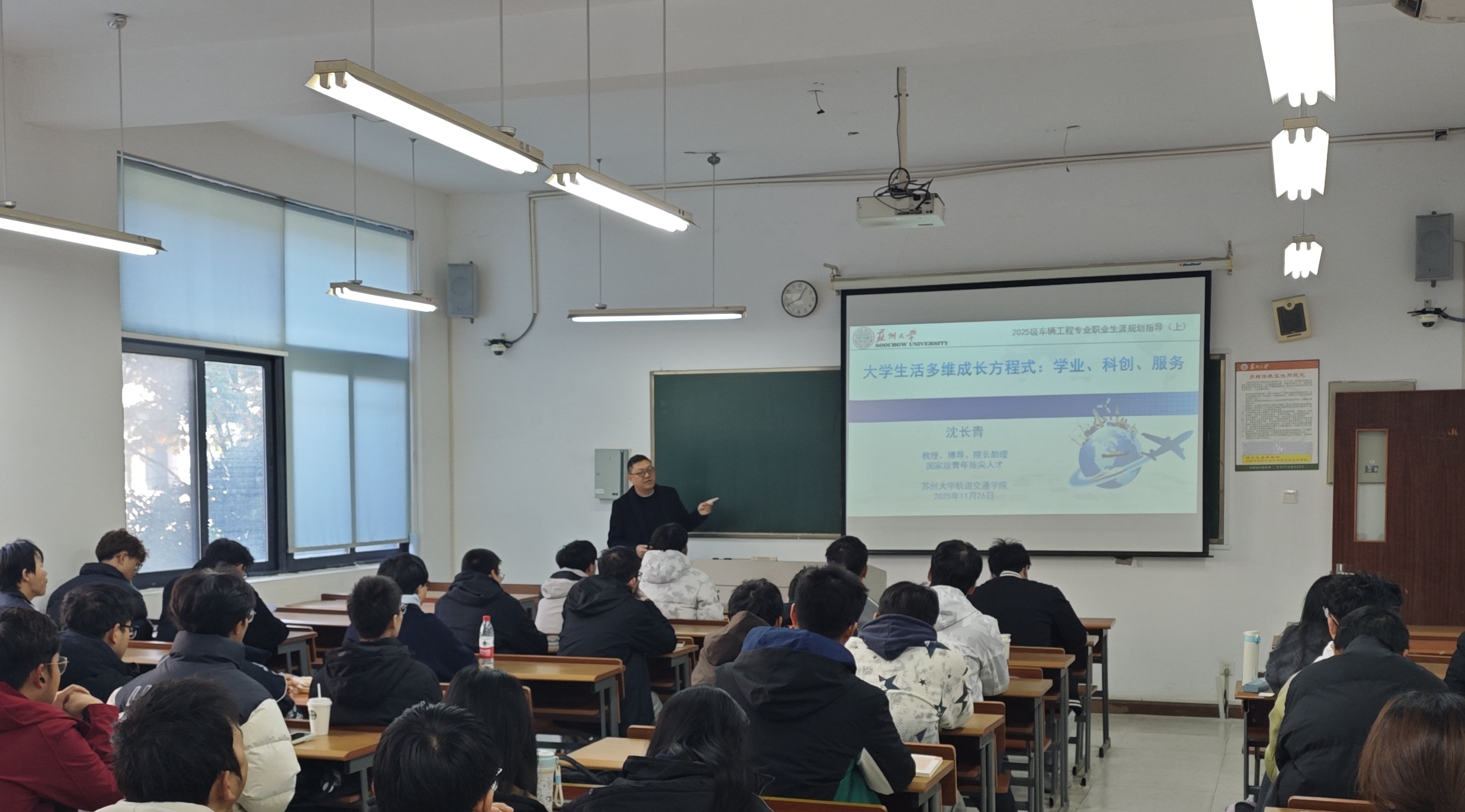 沈长青教授结合自身求学与执教经历,为车辆工程25级新生作了题为《大学生活多维成长方程式:学业、科创、服务》的专题讲座,深入阐释如何成长为全面发展的苏大青年。讲座以“三维协同成长”为主线,指出“学业是立身之本”,引导新生迅速适应大学与中学的学习差异,既要理解课程章节间的逻辑脉络,把握学科衔接关系,也要探索适合个人的高效学习方法,夯实专业基础。他强调“科创是强身之道”,鼓励同学积极参与科创竞赛与实践项目,将课堂知识转化为实践能力,在挑战中培养创新思维。同时倡导“服务是暖心之举”,通过志愿服务凝聚集体、传递温暖,在奉献中实现自我价值提升。整场讲座逻辑层层递进、内容翔实丰富,为新生勾勒出清晰的大学生活发展路径,既解答了初入校园的困惑,也激发了大家在学业、科创与服务中全面成长的内在动力与责任意识。
