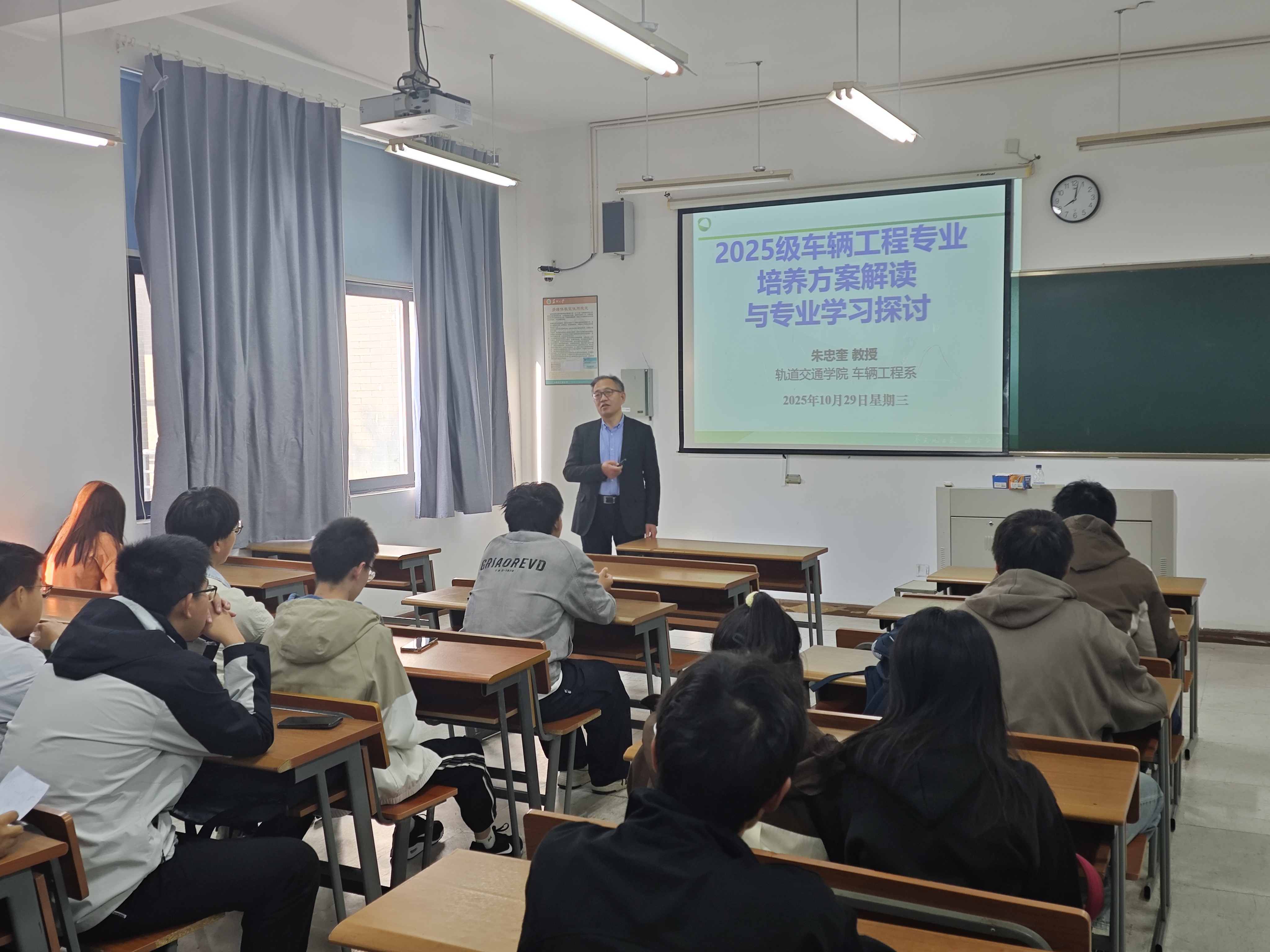 朱忠奎教授为同学们带来了一场题为《2025级车辆工程专业培养方案解读与专业学习探讨》的精彩讲座。讲座内容系统全面、资料翔实,朱教授以“基础通识—专业核心—实践创新”三大课程模块为主线,详细解析了未来四年的修读体系,内容覆盖机械制图、汽车理论等基础课程,智能网联汽车技术、新能源动力系统等专业核心课程,以及金工实习和毕业设计等实践环节。他深情回顾了学院自成立以来,专业在课程体系完善、师资力量增强和科研平台升级等方面的发展历程,并逐一介绍了各专任教师的研究方向与教学特色。讲座尾声,朱老师结合个人的求学与教学经历,分享了“重基础、强实践、善创新”的专业学习心得,勉励同学们以行业发展需求为指引,扎实钻研专业知识,努力成长为具备扎实工程素养与高度社会责任感的高素质人才。