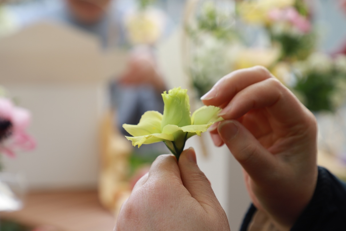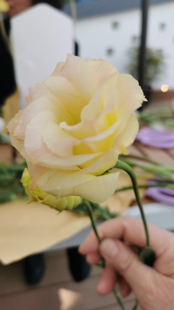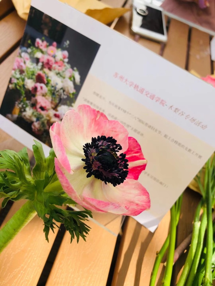 满面春风的女教师们陆续到场后,培训活动首先从花材介绍开始。花艺师如数家珍的为大家一一介绍了当天使用到的花材名称、特点,洋玫瑰,银莲花,香雪兰、白色的紫罗兰、伞状的手球,老师们聚精会神的听着,不时发出或意外或恍然的感叹。