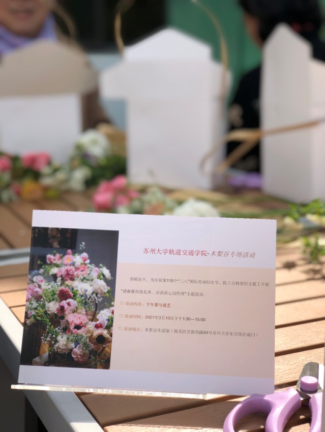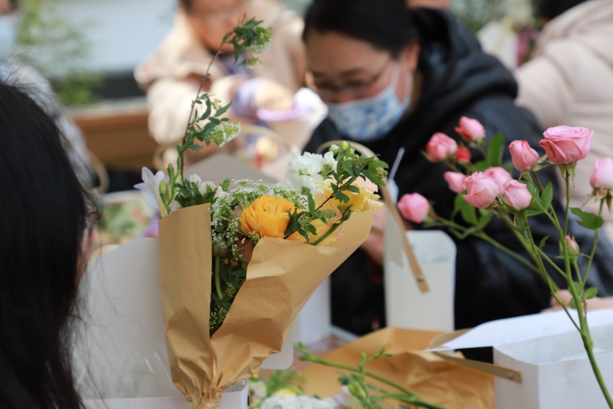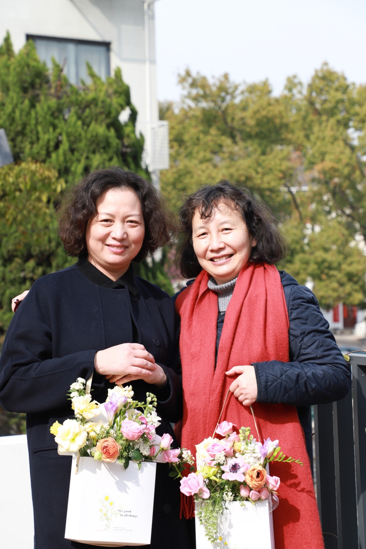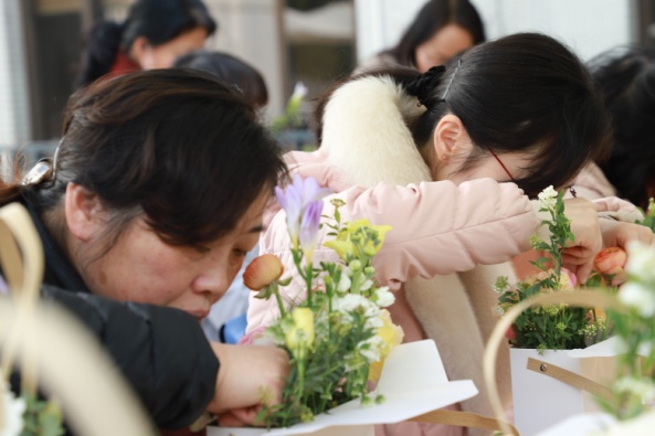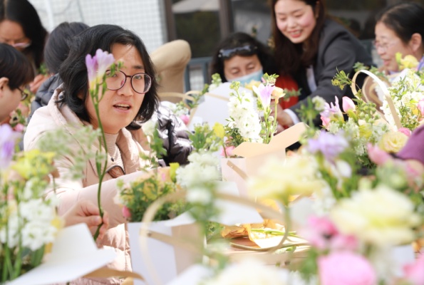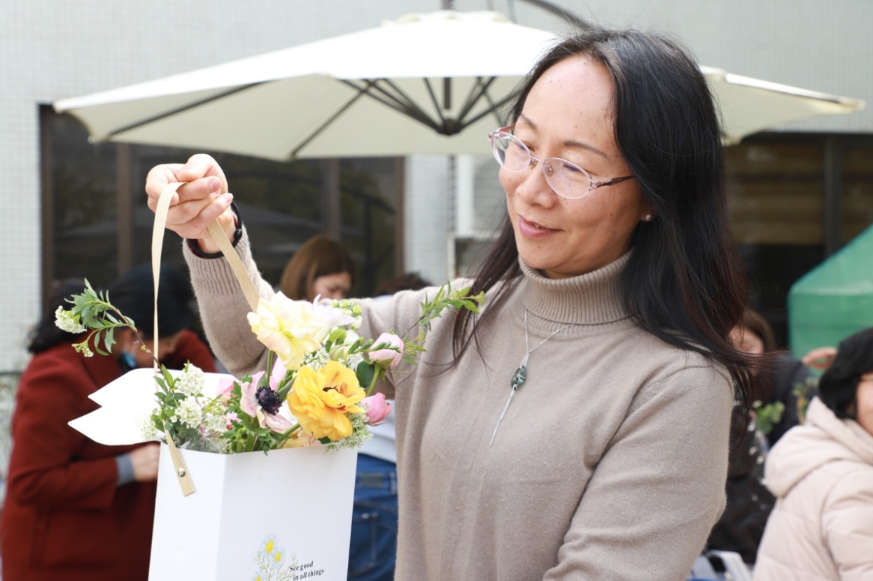不同品种的花卉在精致的花篮中高低错落、俯仰呼应,活动现场可谓色彩绚丽,花香四溢。看着自己亲手完成的插花作品,女教职工们笑靥如花,纷纷与花作合影。