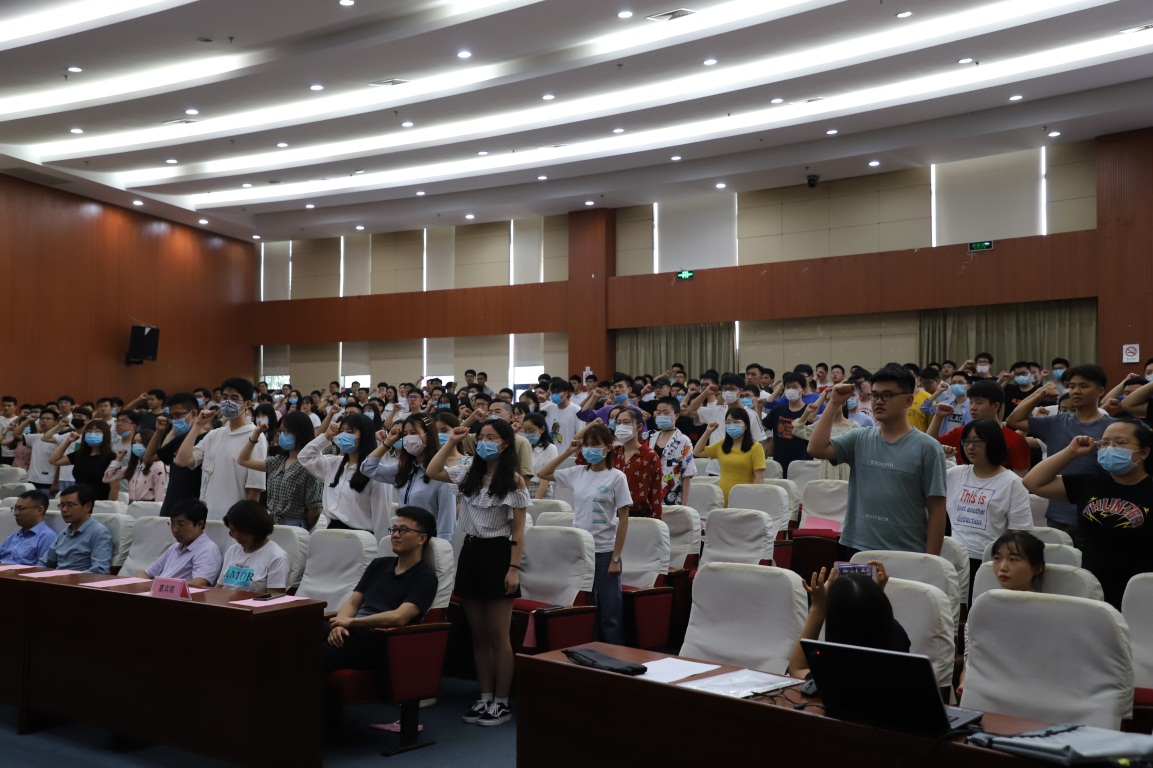 接下来,本科生毕业生代表钱露露上台发言。她在这里度过了难忘且丰富的四年:烂漫的桃花梨花、校园里的小松鼠、热闹的灯光篮球场和灯火通明的交通大楼……每一处都有她的回忆,也有大家共同的回忆。即便是各奔东西,她希望大家能够永远将母校铭记在心。随后,钱露露同学带领全体毕业生宣誓,握紧的右手包裹的是力量,誓词铿锵,打在了心上。